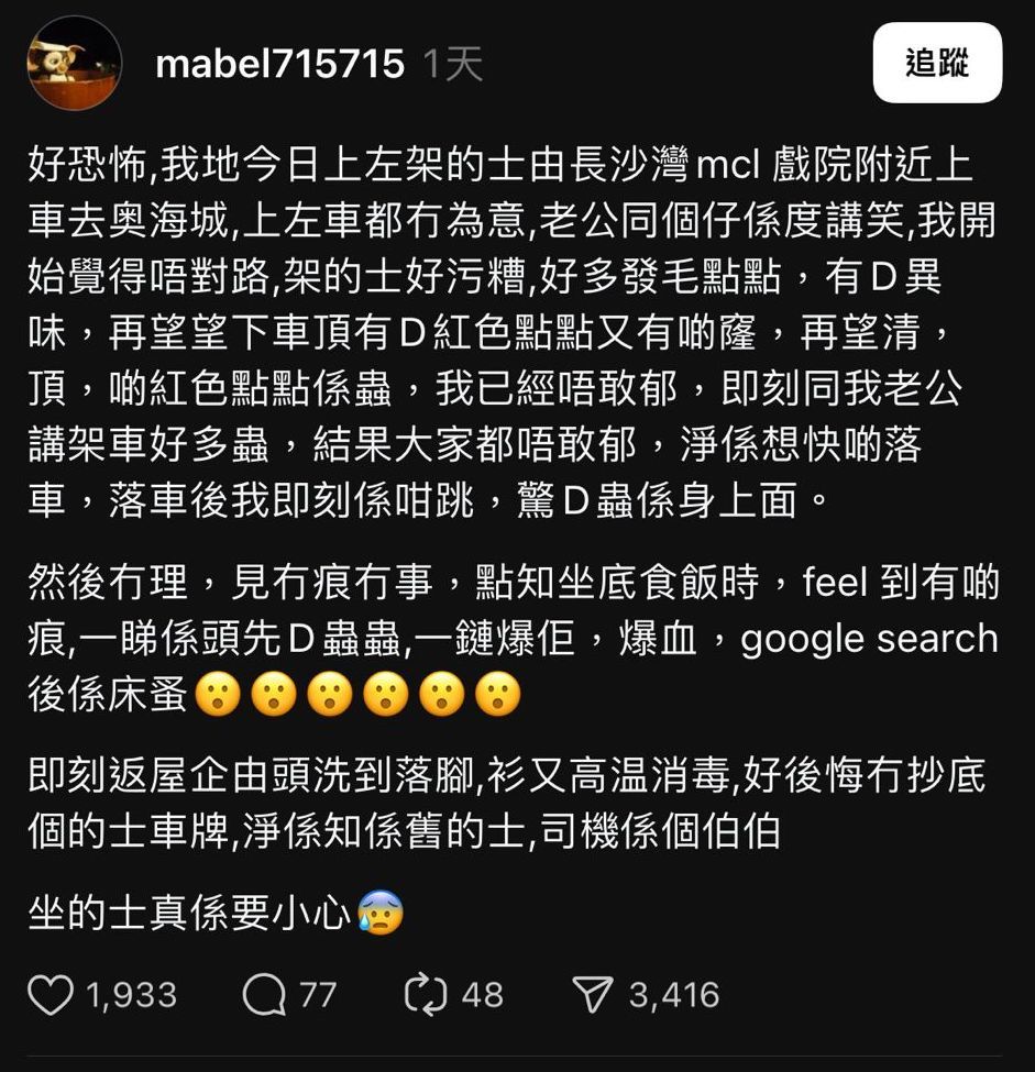 【的士/床蝨/交通公具衛生】有網民在Threads發出一則帖文,分享一家三口乘搭的士的經驗,網民與家人不幸坐上一間衛生程度極差的的士,最恐怖是發現車頂有不少紅色點點,看清楚點原來是蟲,短短長沙灣至奧海城的車程,事主與丈夫都不敢妄動。事件後續更驚嚇,下車後發現床蝨已爬上身更吸飽血。這則恐怖的士帖文到1926讚好、3392個轉載,不少網民都回覆有相同的經歷,亦分享遇到床蝨的處理方法。