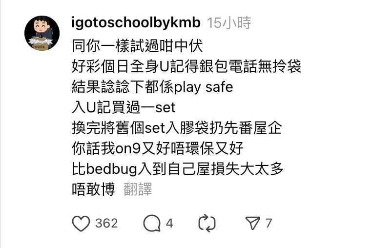 💬「入U記買過一set,換完將舊個set入膠袋扔先番屋企,你話我on9又好唔環保又好,比bedbug入到自己屋損失大太」