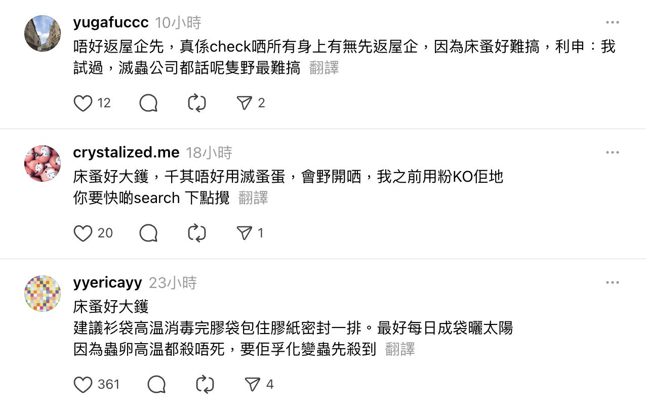 💬「唔好返屋企先,真係check晒所有身上有無先返屋企,因為床蚤好難搞,利申:我試過,滅蟲公司都話呢隻野最難搞」