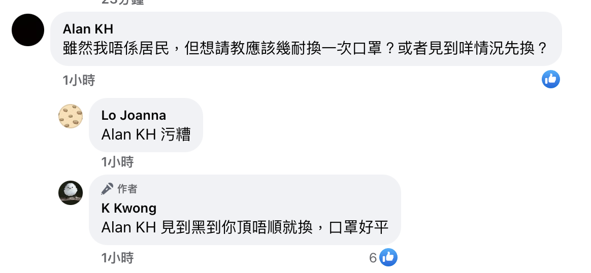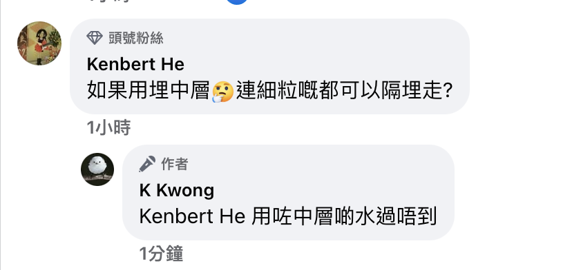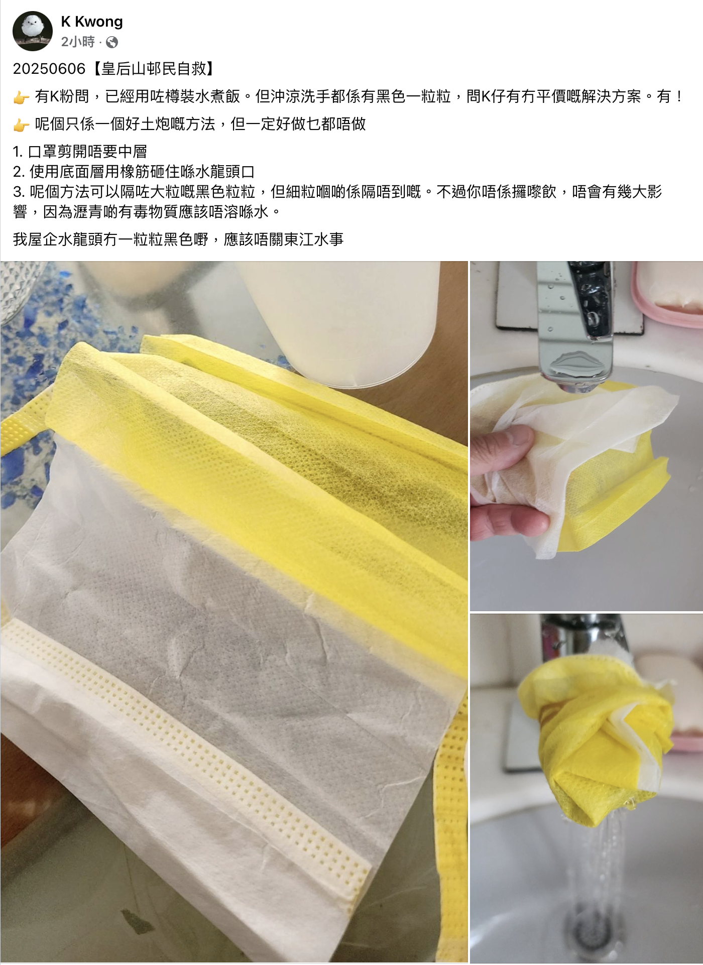 化學博士K Kwong在其Facebook中表示有K粉(皇后山邨居民)問已經用咗樽裝水煮飯,但沖涼洗手(食水)仍然有黑色一粒粒,問他有沒有平價嘅解決方案。K Kwong表示:「有!」是一個既簡單又土炮的方法,而且只需用到家居必備的不織布口罩,成本超平。