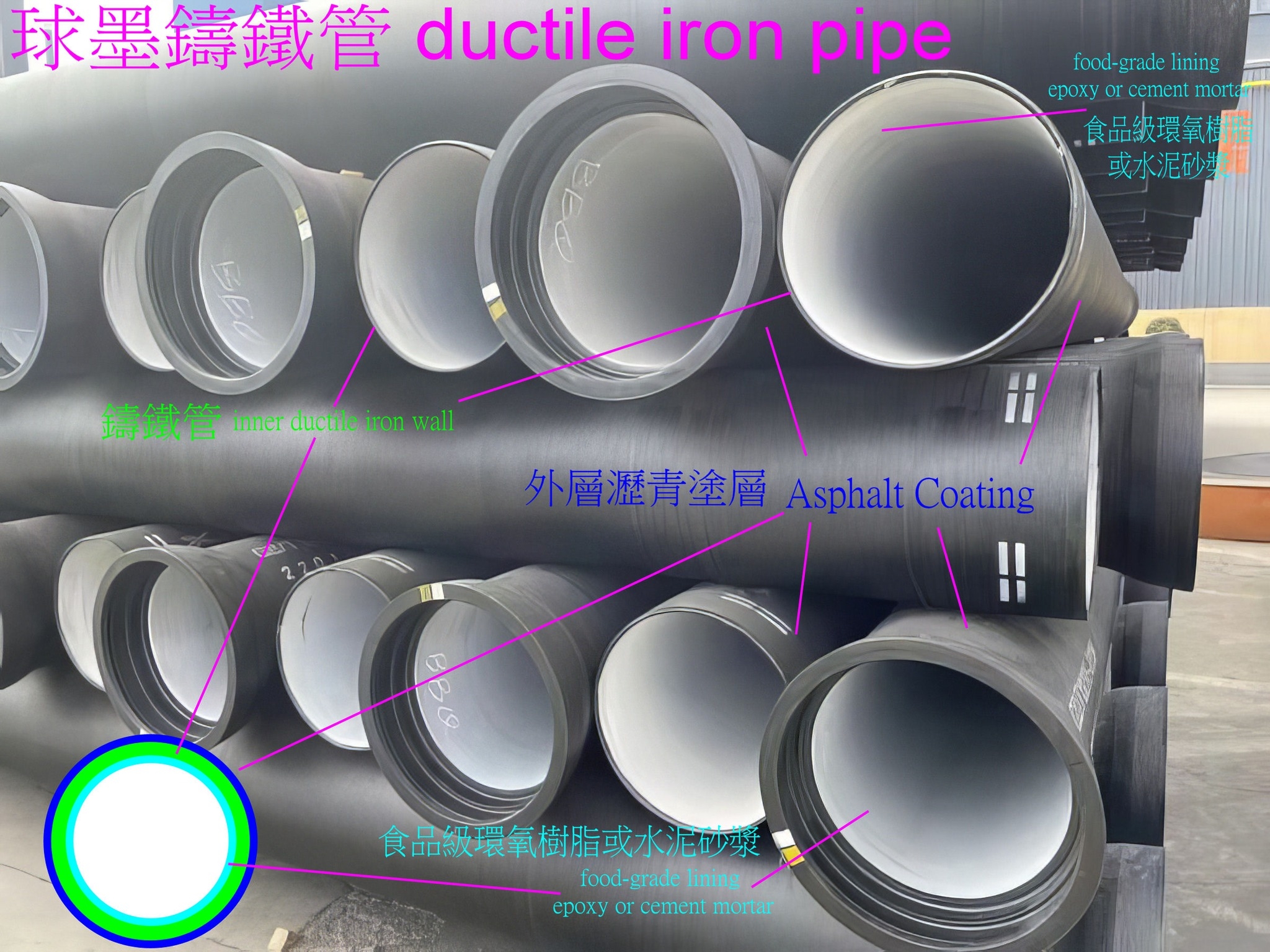 2️⃣鑄鐵管壁(結構層)→ 高強度球墨鑄鐵,不透水且加固支撐。