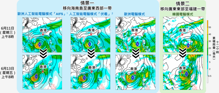 🌧️⚡預計低壓系統會在本週後期移向海南島至廣東西部沿岸一帶,熱帶氣旋「西登」(下圖情景一)香港,屆時本港驟雨會增多會比「東登」(下圖情景二)為香港帶來惡劣天氣的情況較高。