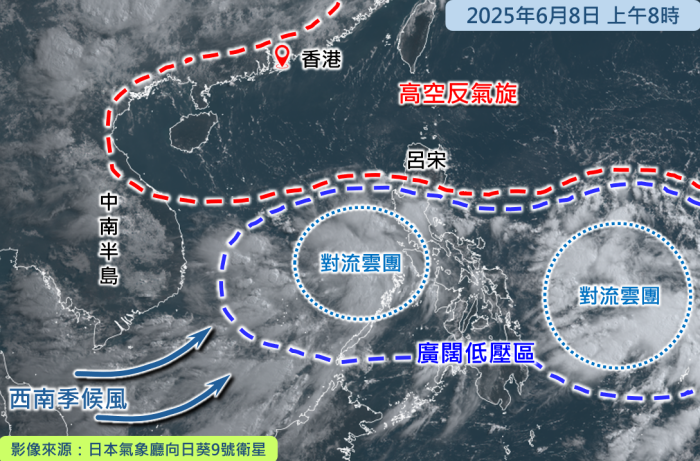 ☀️ 南海北部及廣東沿岸受高空反氣旋支配,天氣普遍晴朗,日間酷熱。本港未來兩三日(6月9至11日)受高空反氣旋影響,持續酷熱,大致天晴。