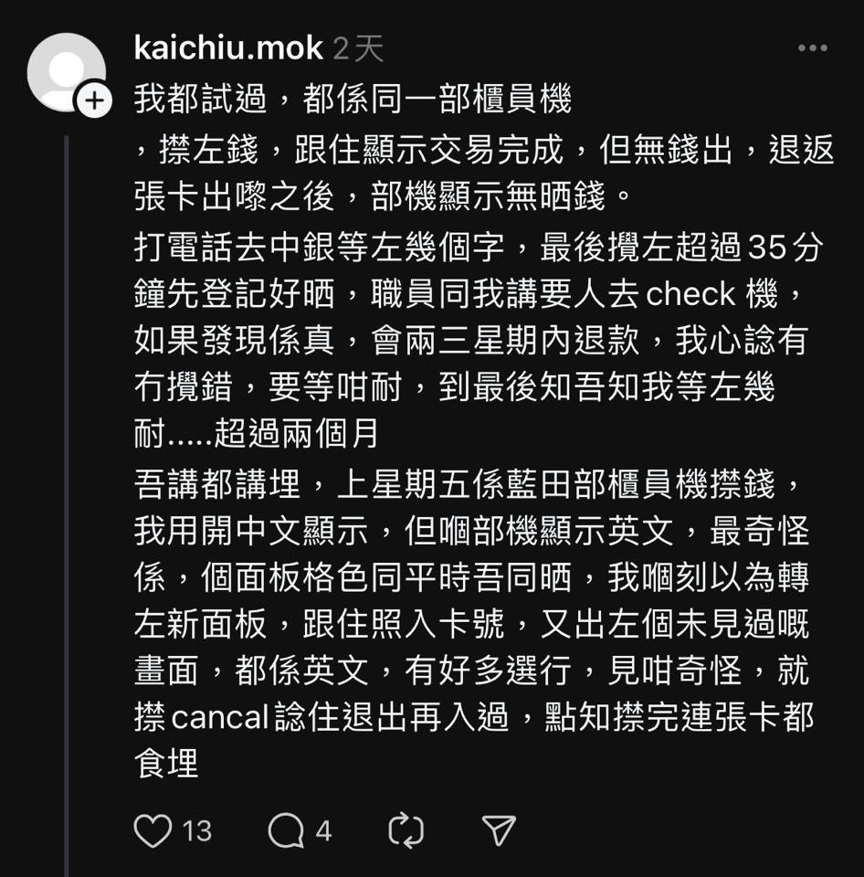 💬有網民經歷更亦令人無奈,亦係撳錢無錢出,要花長時間聯絡客服,最終等候起過2個月追討損失。同一位網民亦於上周在藍田地鐡站使用自動櫃員機提款,機器出現奇怪的狀況,即使想按「取消」仍被「食卡」