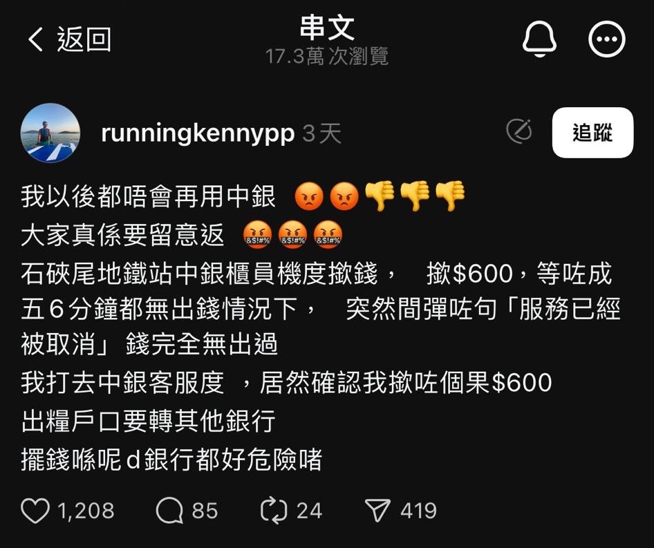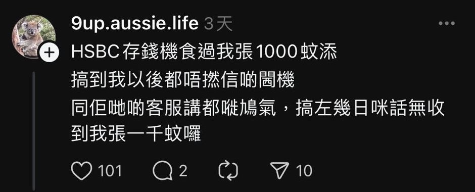 【銀行存款/ATM/自動櫃員機】銀行近期很多事,繼早前有網民使用ATM入錢後,及後發現銀行並沒有入帳,最近又有網叫在社交平台Threads指在自動櫃員機撳錢,居然無錢出,致電客服得到回覆令人更憤怒!事主的帖文得到17.3萬次瀏覽、1208個讚好及419個轉寄,最令人意想不到的,是事發櫃員機原來不是首次出事!