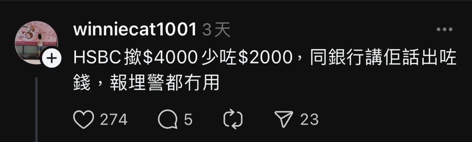 💬網民表示曾撳$4000卻只出$2000,銀行卻否認,即使報了警也未能追討損失。
