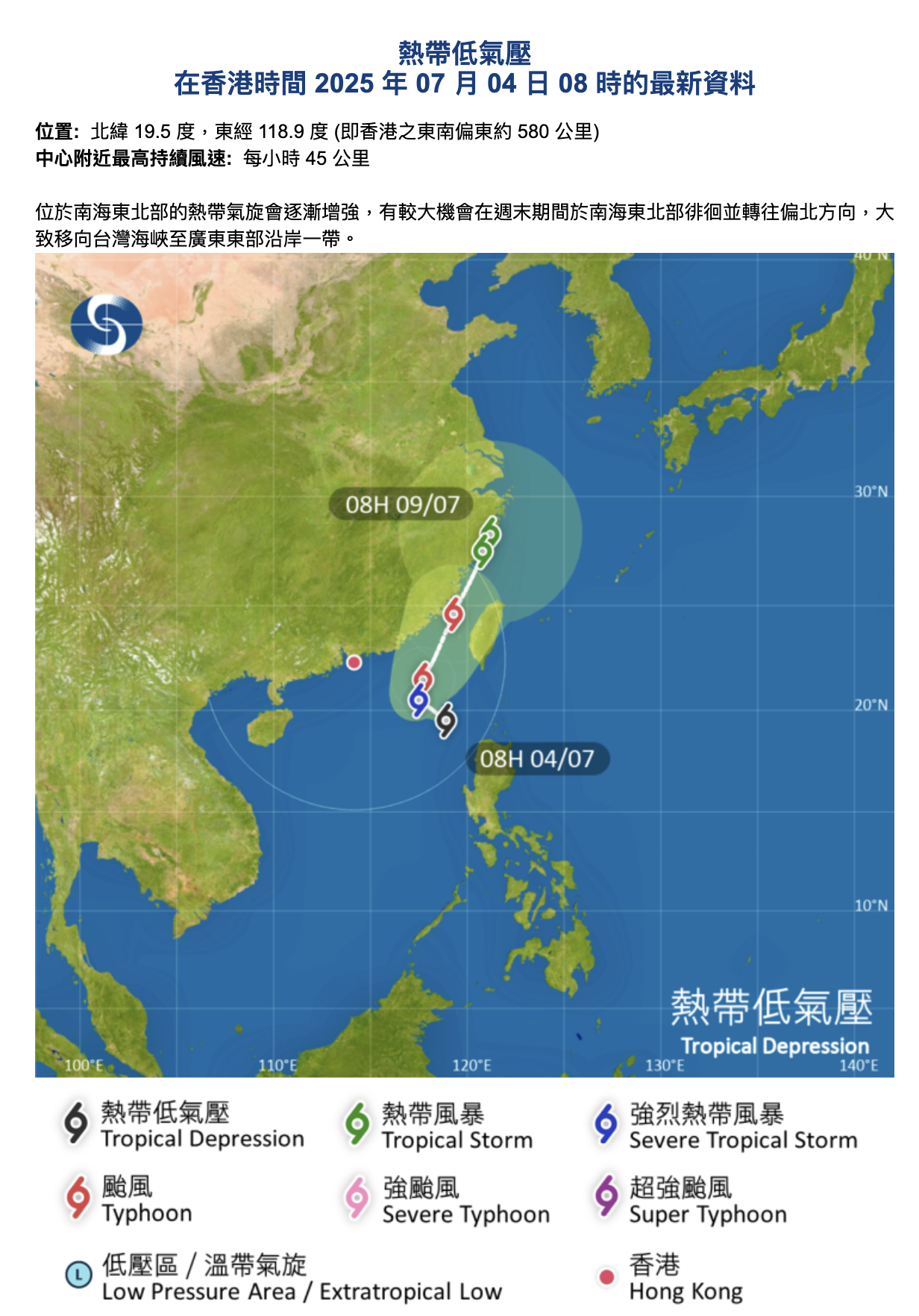 【香港打風/熱帶氣旋/低壓槽/香港天氣】香港天文台於今日(7月4日)上午9時30分發出特別天氣警告,將於下午12時20分發出一號戒備信號,該熱帶低氣壓環流較為細小,移動緩慢,今日下午將維持在香港以外400公里距離,預計熱帶氣旋將會於周末於南海增改,有機會移動至廣東東部沿岸。