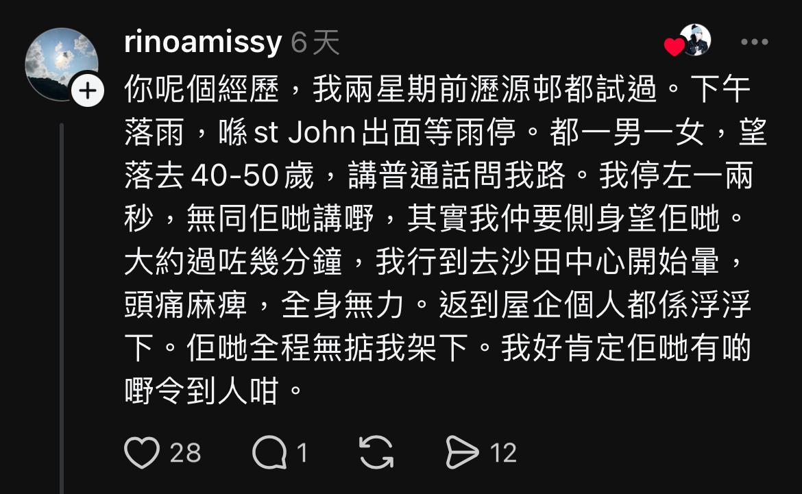 💬 另一名網民就在沙田瀝源邨遇過相似情況,網民表示有一對普通話男女問路,事主已沒有回答他們,但幾分鐘後即感暈眩、頭痛及全身無力。事主強調該對疑似不法份子與事主無身體接觸。