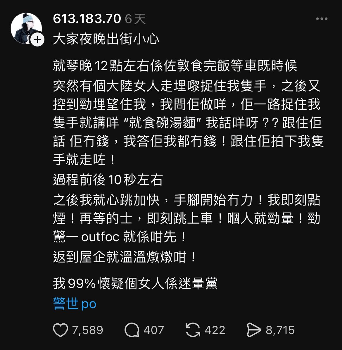 【迷暈黨/中環騙案/迷暈黨/佐敦迷暈黨】迷暈黨近期越來越猖獗,有香港短片創作人何西尊於Threads發文,表示近日在佐敦彌敦道疑似遇上迷暈黨,事主突然被一國內女子捉住手臂,10秒後開始心跳加快兼開始無力,直至現在仍未搞清「被迷暈」的方式,特別在Threads出文及拍片分享、希望能夠提醒大家,特別是女士們。