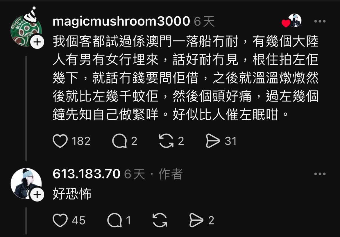 💬 有網民表示今次事發在澳門,發生在他的顧客身上,一下船就有大陸男女湊近扮相識,跟住拍咗受害人幾下後、話沒錢,要受害人借錢。受害人在志識模糊下居然畀幾千元騙徒,幾個小時後才知剛才發生甚麼事。