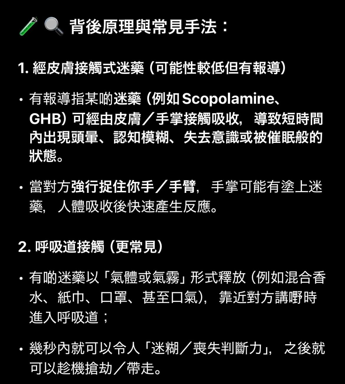 💬 有網民用ChatGPT找尋找這類騙案的「迷暈」方法,有可能是騙徒拍打受害時使用「經皮膚接觸式迷藥」(可能性低,但亦有相關報導)