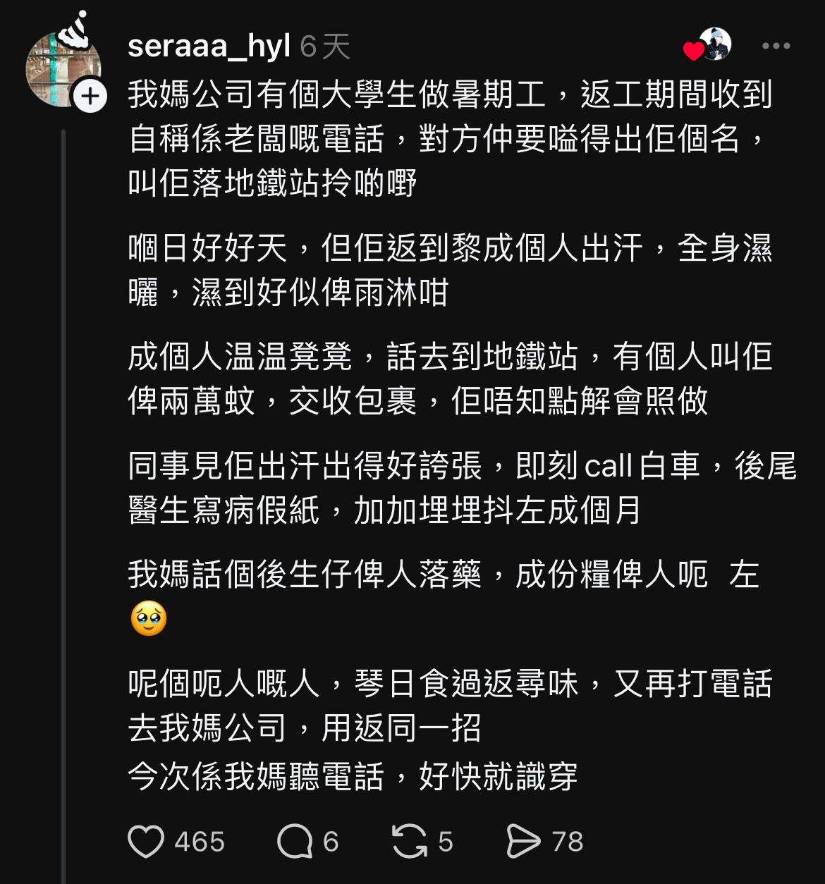 💬 有網民表示其媽媽公司的一名暑期工有類似經歷,不法份子先假扮該名受害人老闆騙受害人到地鐡站。但當受害人回到公司時全身大汗、表示有人叫他付2萬元(整個月薪金),他居然照做。由於受害人的狀態太差,同事幫忙召救護車送院,應該是被落藥了。最離譜是該騙徒再度用相同手法致電受害人公司,不過被網民媽媽識破。