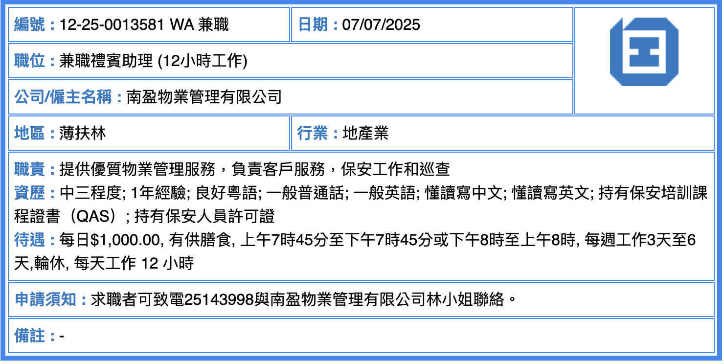 ☎️ 求職者可致電25143998與南盈物業管理有限公司林小姐聯絡