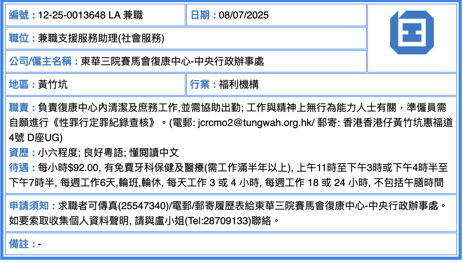 🏢 公司/僱主名稱:東華三院賽馬會復康中心-中央行政辦事處