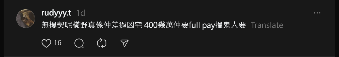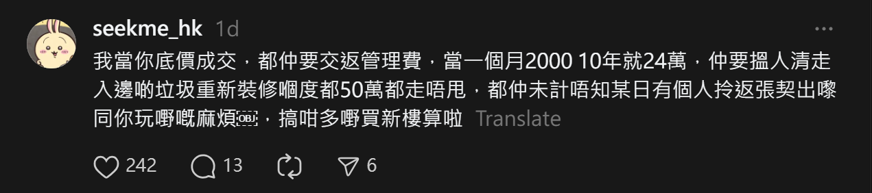 💬有網民指出,由於物業狀態不佳、前屋主有不少物品及垃圾遺留在屋內,新業主要清理及重新裝修花費不少,加上物業無契,不如買新樓省卻麻煩。