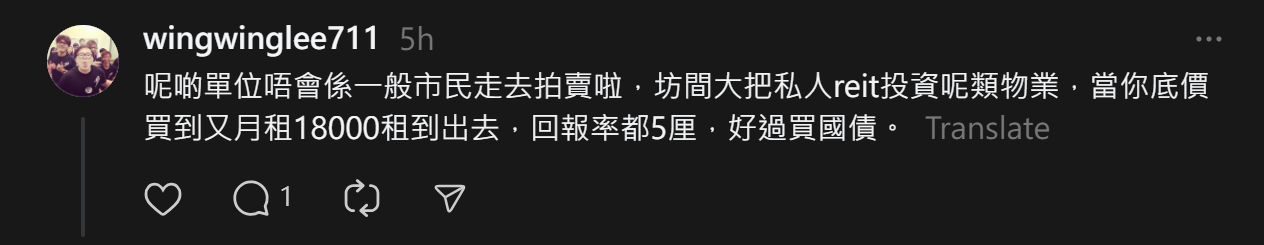 💬有網民指這類物業大多數不會由一般市民透過拍賣購買,多屬REIT(不動產投資信託)購入來作投資。