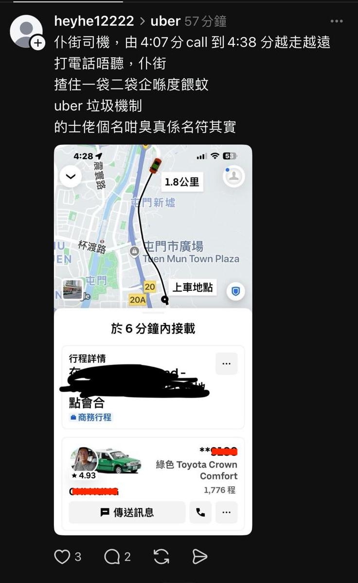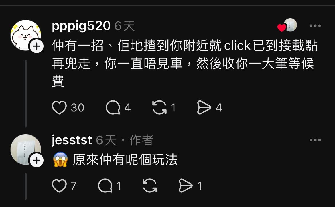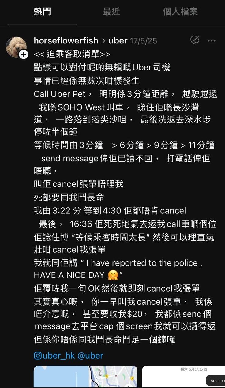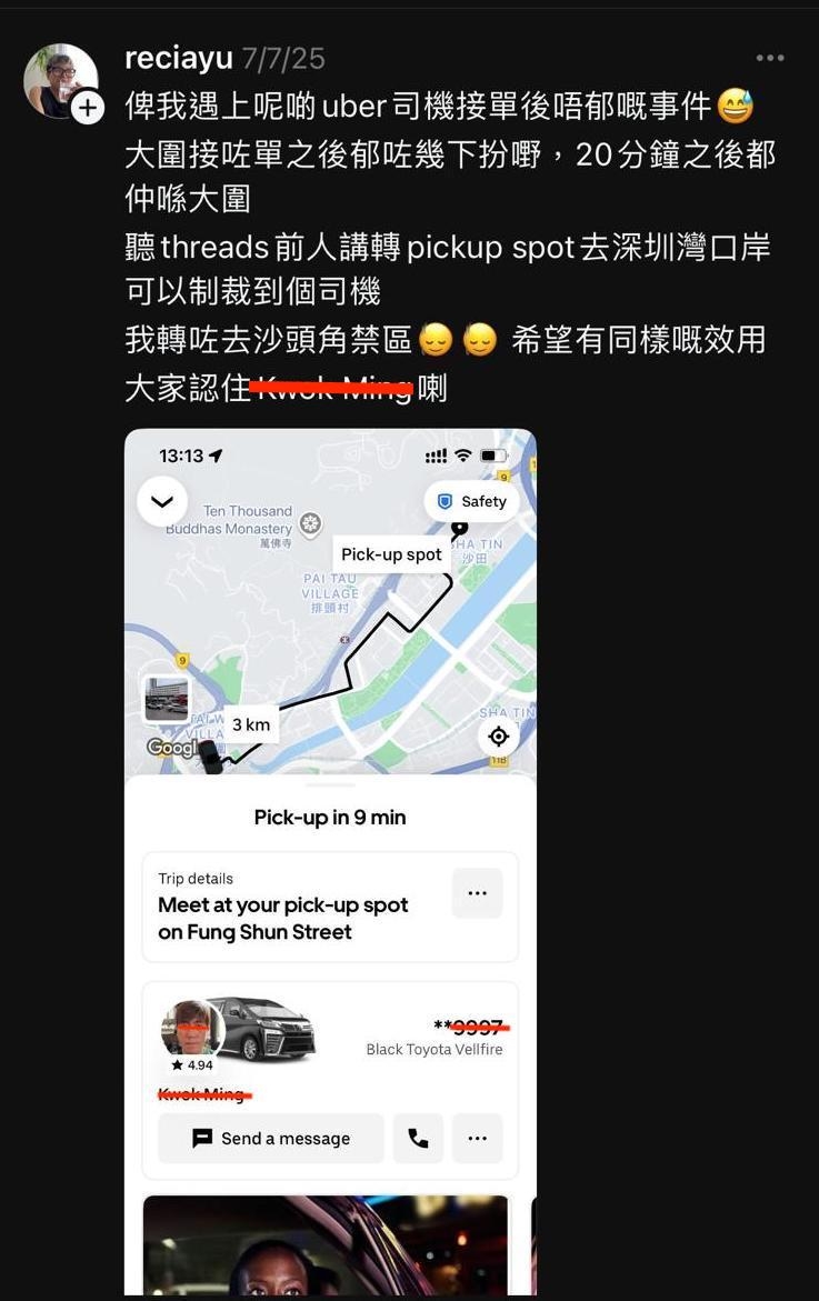 【Uber/Uber Taxi司機/Uber Taxi爭議/網約車/濫收車資】Threads上近期一個熱烈討論的話題就是Uber Taxi司機最新蠱惑招數,不少網民在Uber Taxi預約了行程、司機接單後,卻沒有前往指定上車地點接載通知客人,反而駛離指定的上車地點或是亂兜圈,手段最低是堅持不取消訂單、甚至致電要求乘客一方取消訂單,有網民由1pm等到3:30pm仍未等到司機一方取消訂單,最離譜甚至有網民未乘車卻被Uber一方收取車資。