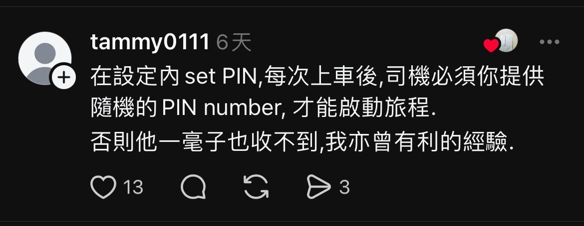✅ 有網民表示只要在Uber設定裏「設定」>「核實你的行程」裏設定Pin Number,司機便要在接載乘客時,輸入乘客提供的Pin Number才可開展行程,避免上述的無賴行為發生。