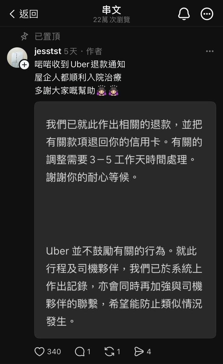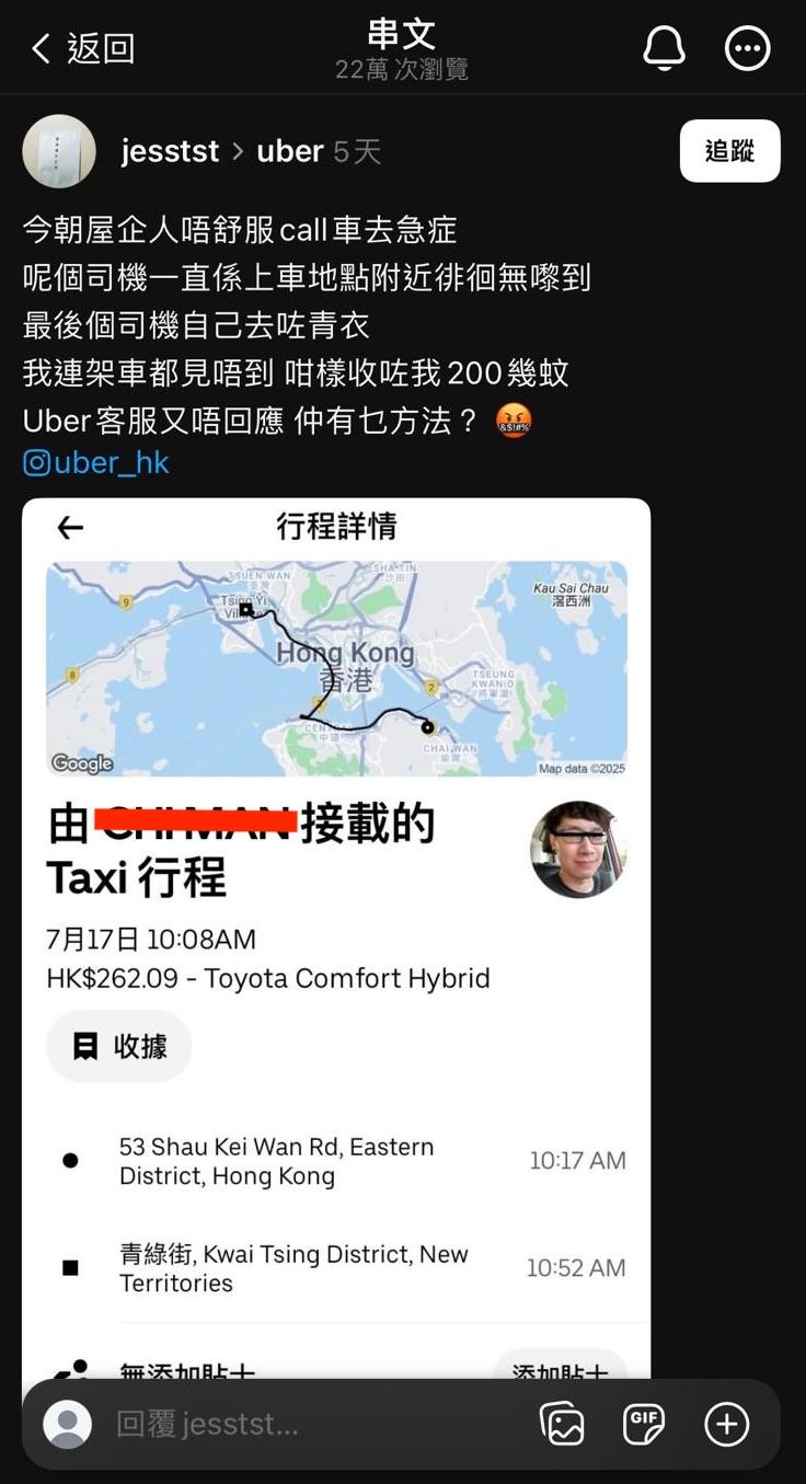 有網民在Threads分享早前電召Uber的不快經歷,帖文得到22萬次瀏覽、1097次讚好及387個轉寄。