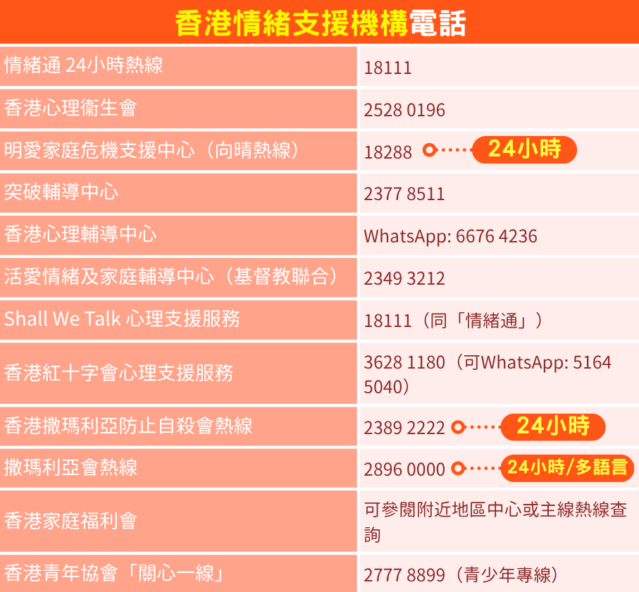 荃灣悅來酒店發生家庭慘案,一名37歲男子患抑鬱症,擔心無力照顧妻兒,在網上社交平台寫下「絕筆」遺書後,於酒店房內將妻子及兩名幼子割頸殺害,最後墮樓身亡,造成4屍命案。根據2022年「全港精神健康指數」調查,約有54.4%受訪者精健狀態處於不合格水平,另有12.1%有抑鬱症徵狀。香港有不少情緒支援機構,針對預防自殺、個人情緒問題、家庭危機、青少年情緒問題、災難後遺症等人士作出支援,部分更是24小時運作,若遇上情緒問題,記得尋求協助。