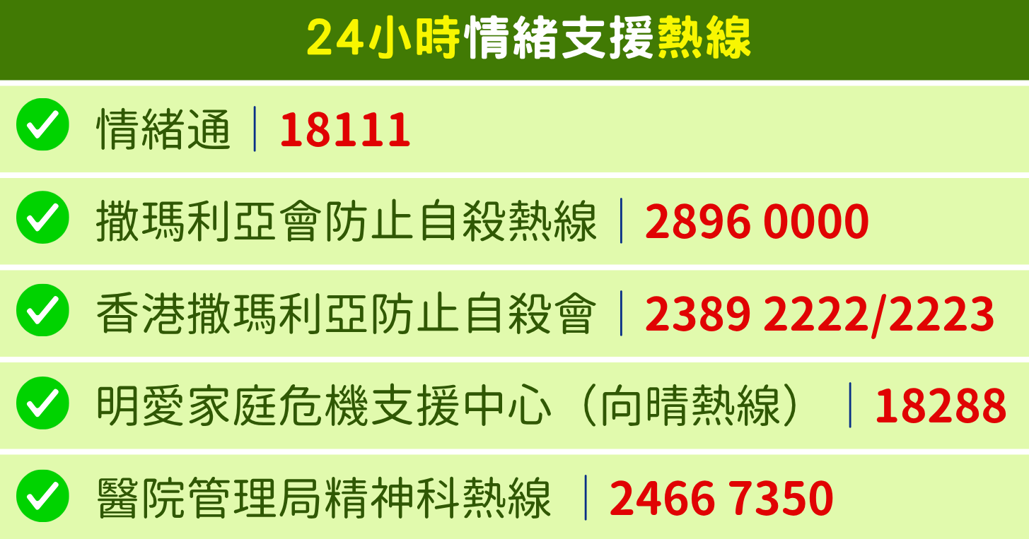 香港撒瑪利亞防止自殺會熱線|2389 2222(🌙 24小時 🌞)