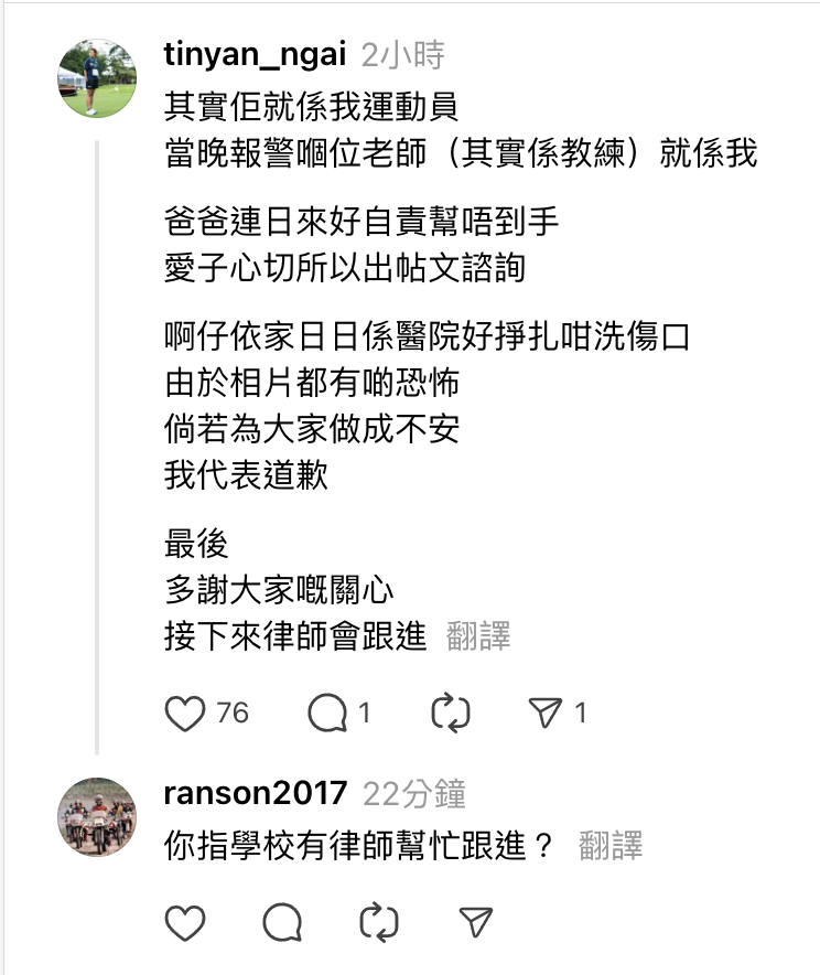 💬當日代受傷青年報警的老師亦有現身,表示傷者父親很自責、覺得自己有「幫唔到手」,亦表示稍後會交律師更進。