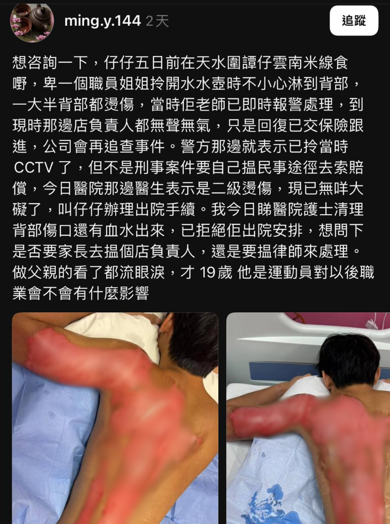 【米線店/連鎖米線店/餐廳意外/民事索償/灼傷/2級燒傷】昨日(7月30日),有食客在銅鑼灣冰室吃鐡板餐時搶火,導致2名女食客燒傷,今日在Threads有無助的父親發文,並附有2張兒子傷勢的照片,顯示受傷青年背部大面積燒傷。傷者父親表示兒子5日前於連鎖米線店用餐,卻意外被店員被滾水淋至2級燒傷。發帖者表示已報警,米線店方面表示已交保除公司跟進,其後沒有再作回應,而警方着他從民事途徑索償。發文者表示不懂其後的法律程序,發文請教大眾怎樣做,網民的回應相當高質。