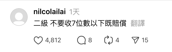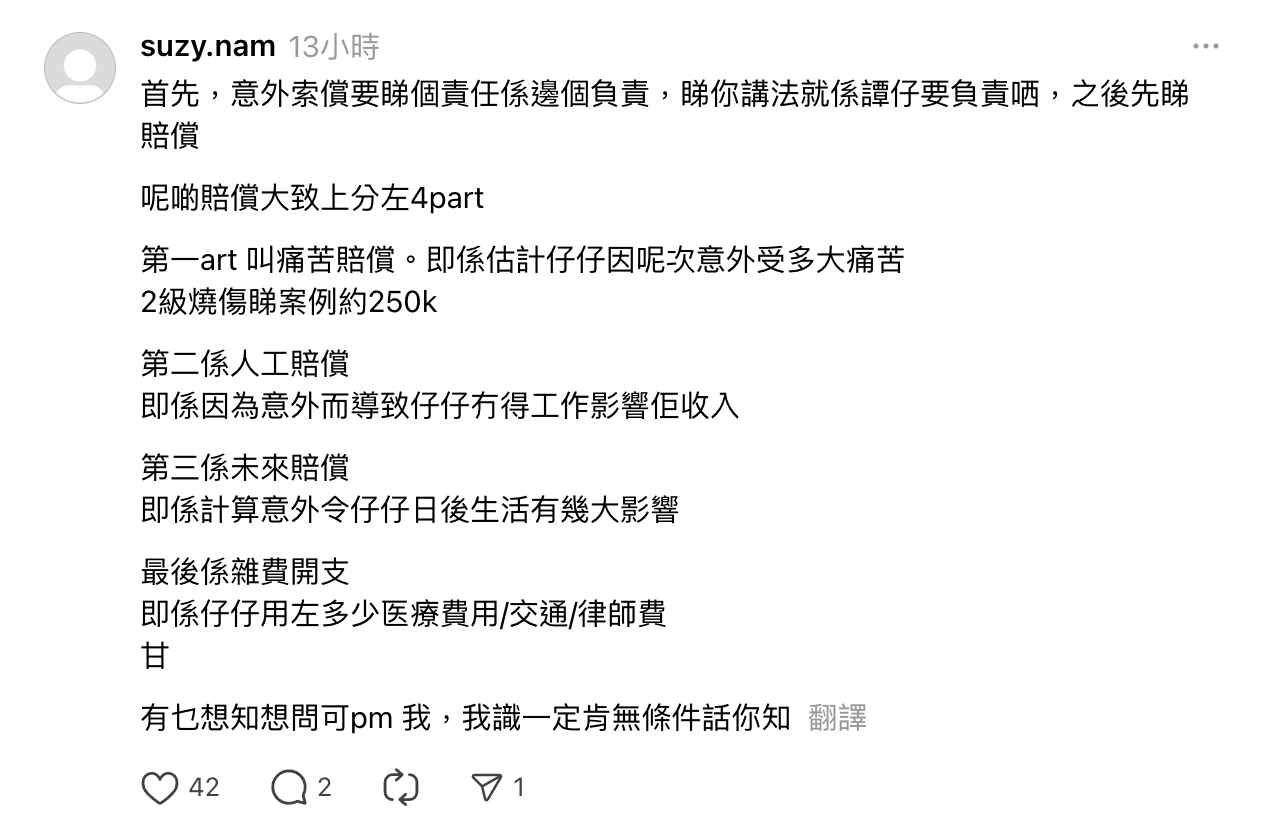 💬 有網民向發文的父親表示受傷人士若判為二級燒傷,賠償金額記得要求7位數(百萬)以上。