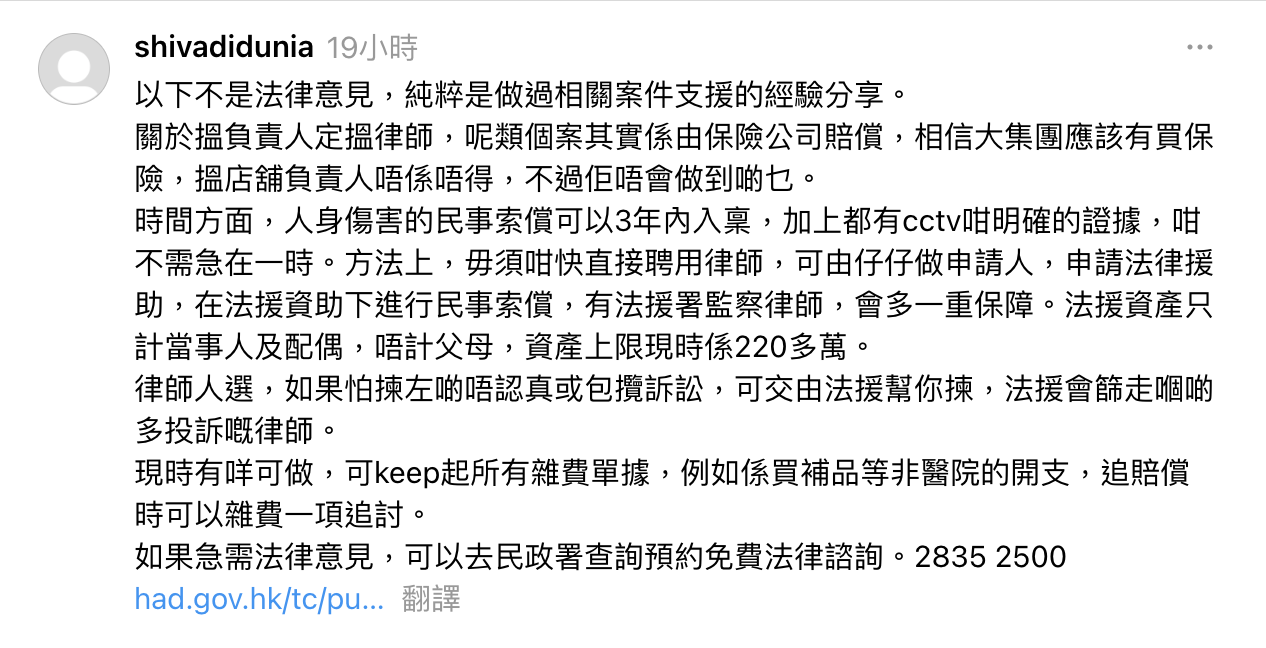 💬有網民着傷者父親不必去分店找負責人,因為這類個案會由承保的公司處理。另外提醒受傷人士有關「民事索償」的時限及流程。亦建議受傷人士父親對法律程序不清楚,民政署設有預約免費法律諮詢及可考慮申請法援。