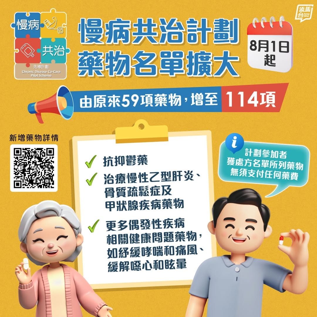 【慢病共治計劃/醫療福利/基層醫療/抑鬱/乙肝/骨質疏鬆/甲狀腺病/哮喘/痛風/中高齡人士/醫務衛生署/長者醫療/預防慢性疾病/糖尿病/高血壓/三高】專為45歲以上人士而設的「慢性疾病共同治理先導計劃」(簡稱「慢病共治計劃」)﹐由8月1日起將計劃基本藥物名單即日起由原來的59項擴大至涵蓋114項藥物,而家除了計劃涵蓋的抗高血壓、調節血脂和降血糖藥物外,多種中高齡人士及長者的常見疾病,如抑鬱、乙型肝炎、骨質疏鬆、甲狀腺病、哮喘、痛風、暈眩等藥物,都獲政府資助,篩查得進入治療階段的參加者可以毋須支付獲處方名單所列藥費。原有及新增的藥物不少都照顧中高齡人士及長者預防慢性疾病,計劃至今約資助了3.4萬市民。