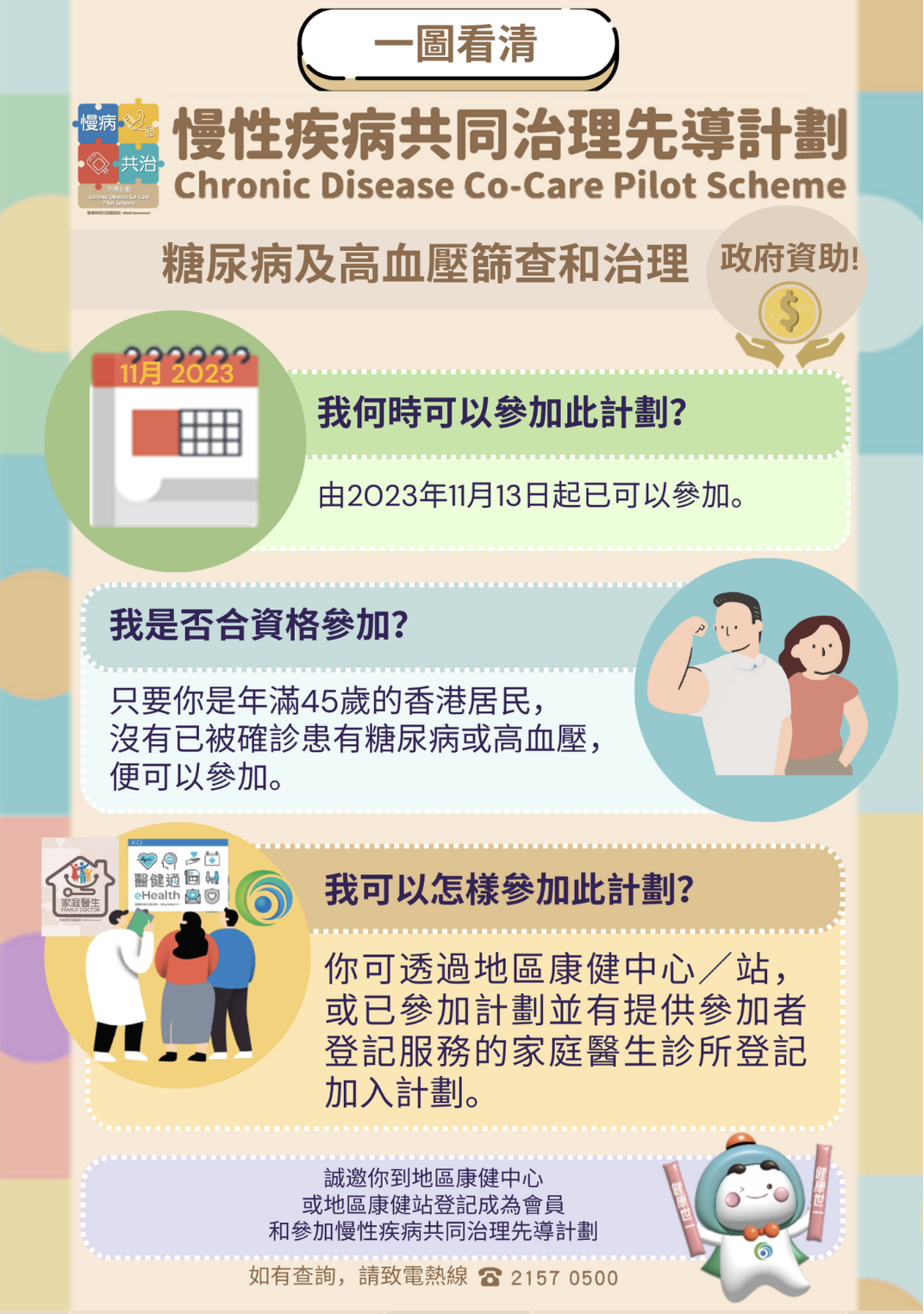 🔵「慢病共治計劃」專為45歲以上未曾確診患有糖尿病或高血壓的香港居民而設,透過政府資助私營醫療市場接受糖尿病、高血壓篩查及血脂檢查等,以達到預防及及早治療的目的。