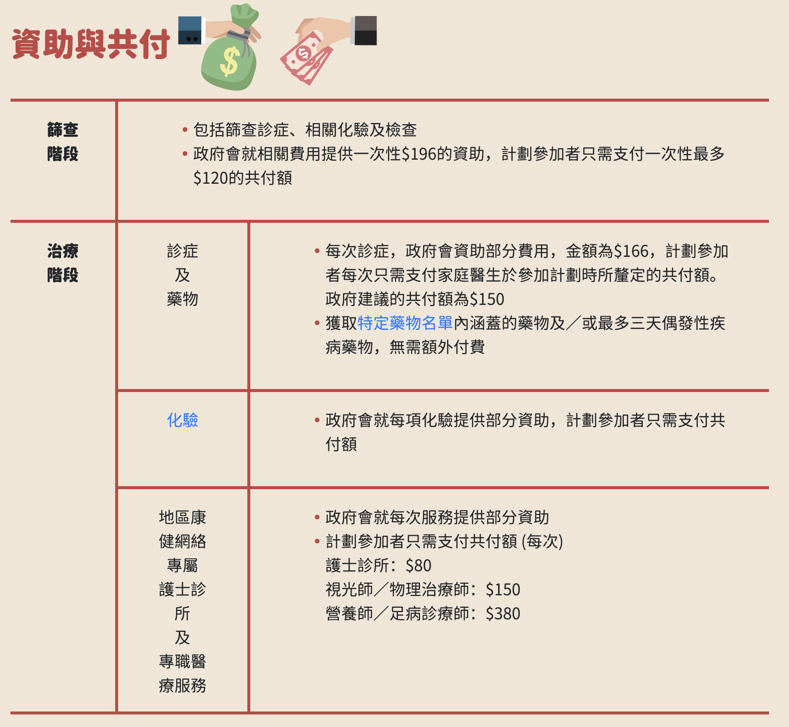 🟣經篩查後被診斷為血糖偏高,或患有糖尿病、高血壓或高血脂的參加者可進入治療階段,並在政府資助下由自行選擇的家庭醫生繼續為其診治,以及按個人健康狀況獲處方藥物,接受專屬護士診所和專職醫療服務跟進。