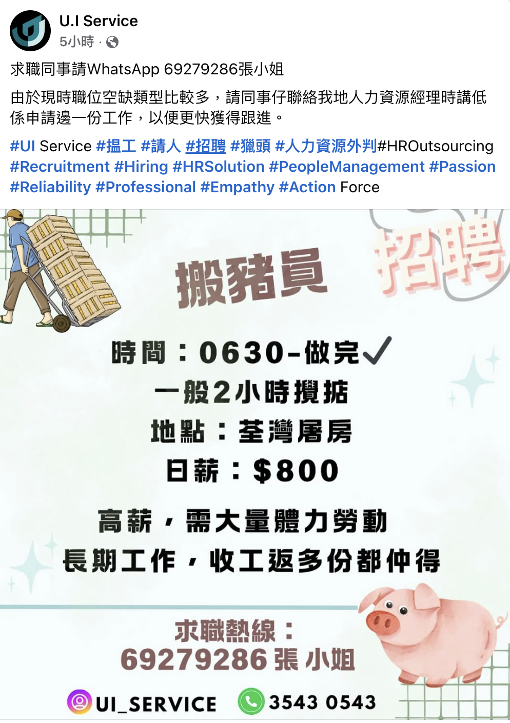 失業搵工|網上現荃灣屠房兼職搬豬員招聘廣告 日薪$800 寫明可2小時攪掂收工!