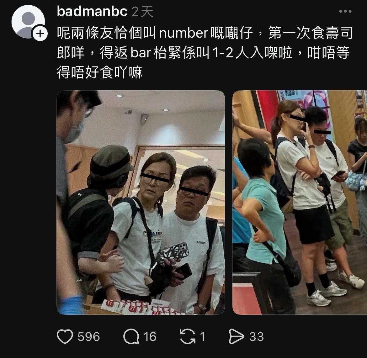 【壽司郎/壽司朗排隊/壽司郎西客/西客】連鎖壽司店壽司郎甚受港人歡迎,不時大排人隊,晚飯時段等一兩小時都是港人集體共識,但日前(8月9日)有網民在Threads分享一家三口不滿壽司郎等位太耐而情緒失控,以粗口辱罵店員的影片,迅即在網上瘋傳,不少網民不恥片中家庭欺負店員,更指他們是「正宗西客」。