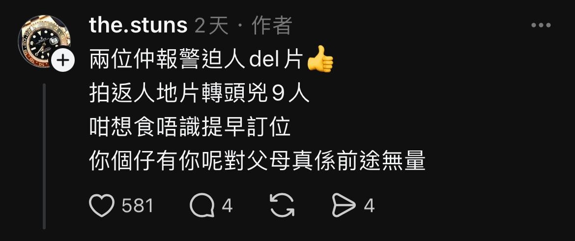 4️⃣ 網民描述當時疑似「父親」的人士出現野蠻行為。「因為未到佢,一路篤職員個額頭一路X佢老X,話佢淨係肯放兩人枱,搞到佢一家三口等咗一個鐘都冇得食,我入到門口嘅時候已經淨係影到佢哋篤職員行去後面繼續」。