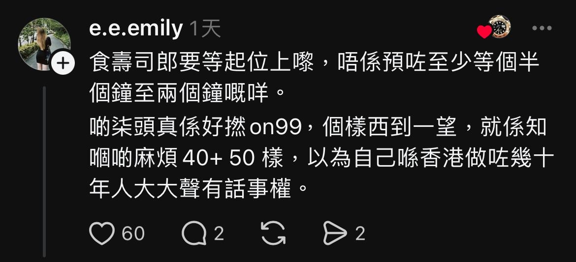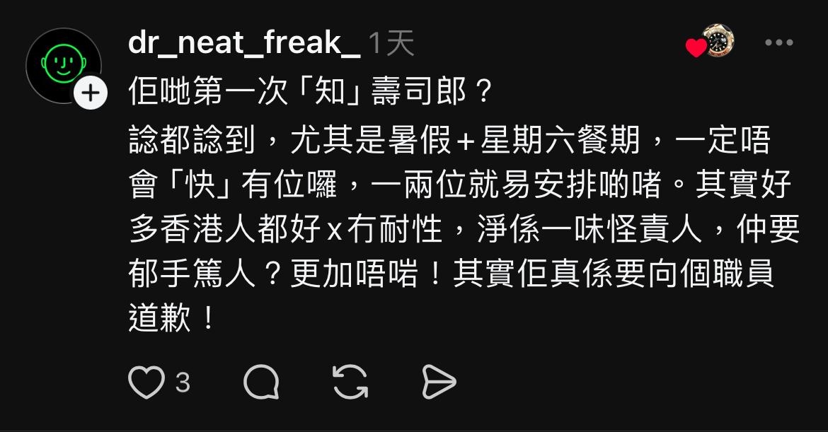 💬有網民嘲笑該家庭第一次食壽司郎,不知繁忙時間等位時間最少個半小時。亦有網友指不少香港人(如片中家庭)無耐性、一味怪責人,應要向店員道歉。