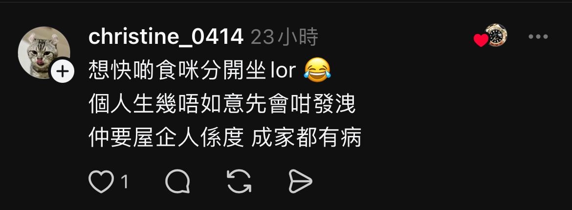 💬另一網民指其實想加快入座的話,選擇分開坐便可以。不應將個人問題發洩在別人身上。