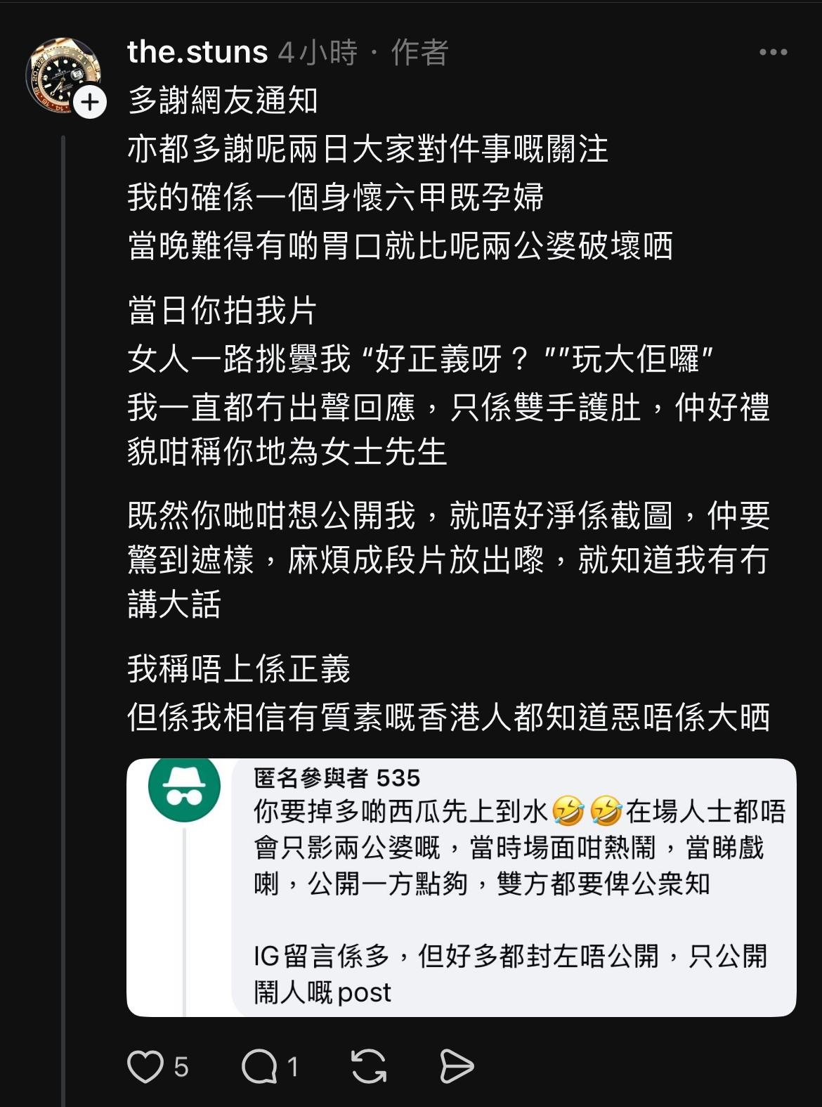 🤬另一位網友(孕婦)通知拍片者,表示一家三口中疑似母親一路向該網挑釁,指「好正義呀?玩大佢囉!」該名孕婦一直都冇出聲回應,只係雙手護肚。事後一家三口中的父親(網名 Good Hong Tat)更疑似「上水」在網友的社交平台質問該網友:「點解要偷影我同我老婆」