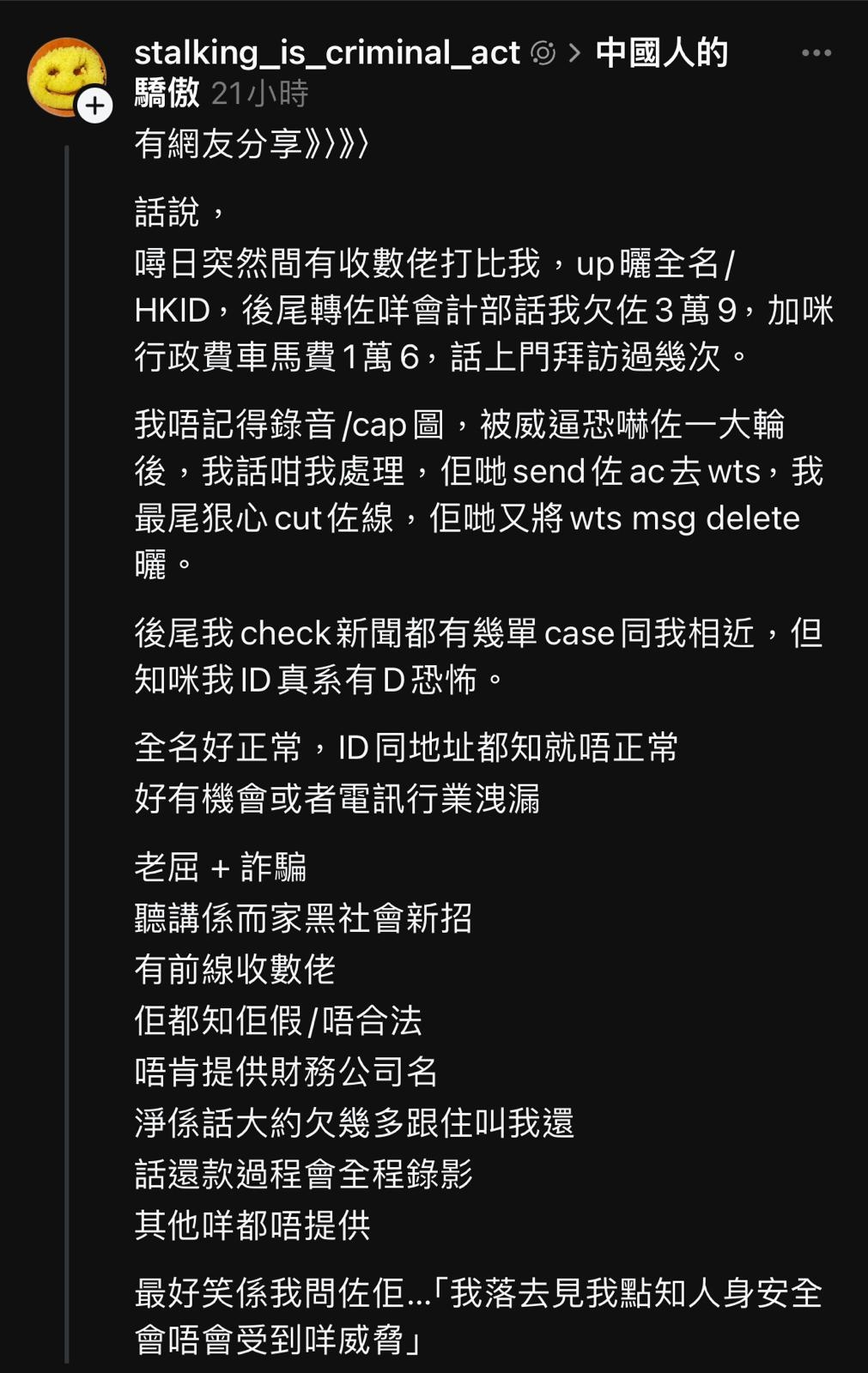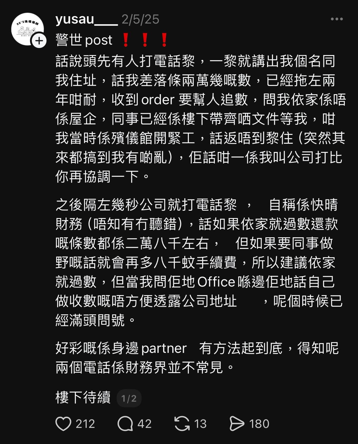 【新型騙案/收數/追債/還錢黨/電騙】近期社交媒體頻繁有事主報告收到可疑來電,來電方表示是「資產管理公司」(即收數公司),表示事主欠債,會派人上門收數,來電一方居然可以說出事主全名、身份證號碼及住址,根據多個接收這種來電的網友表示,欠款通常為9000至30000萬多元。