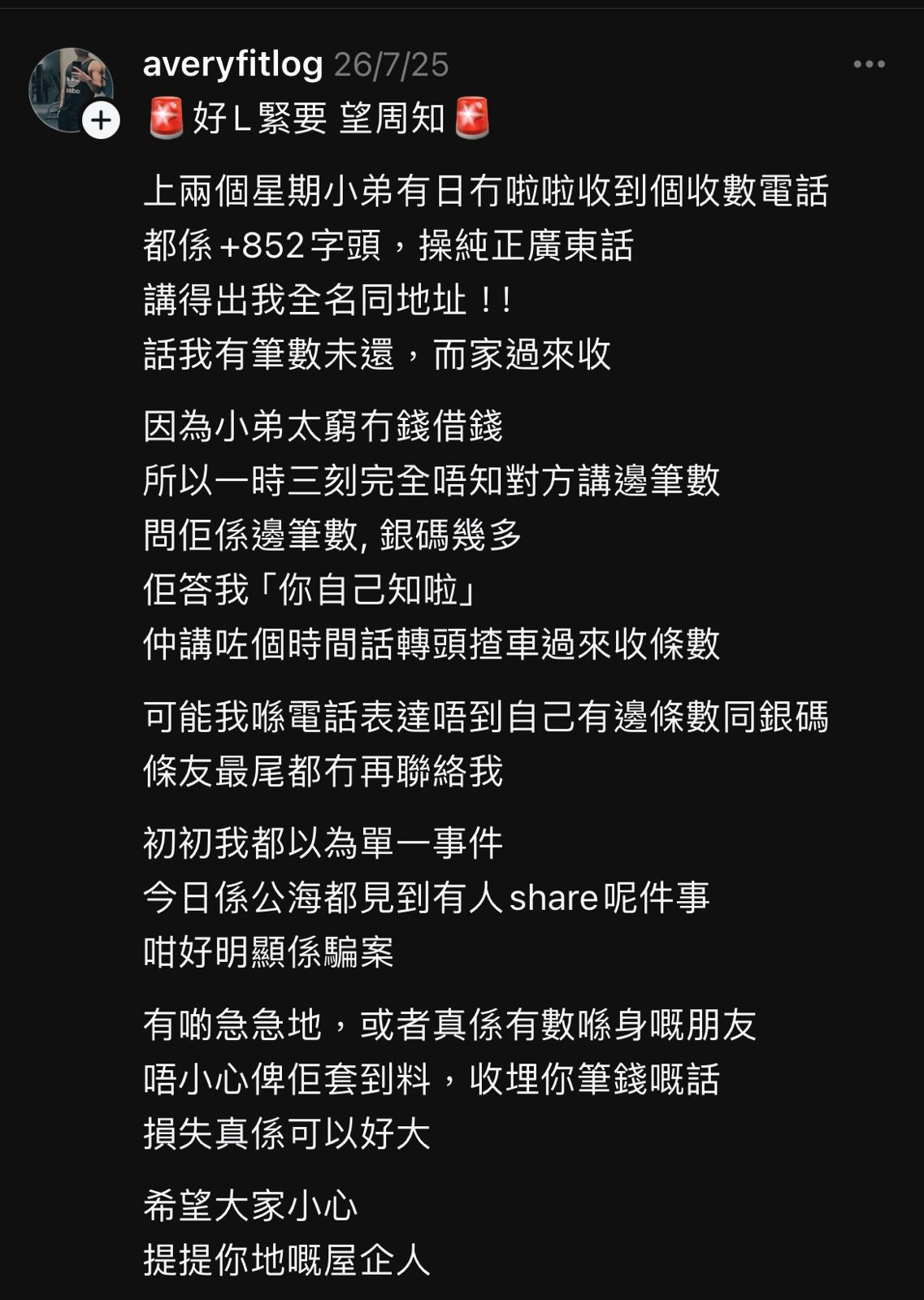 有網民早前收到此類「追債」電話,電話號碼是+852 字頭、亦操純正廣東話。
