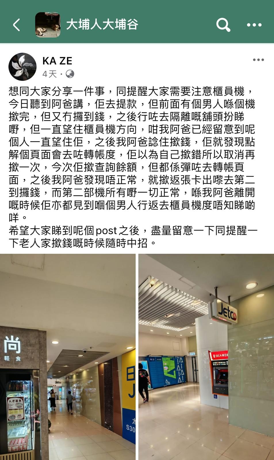 【新型騙案/長者騙案/長者防騙/大埔騙案/櫃員機失靈/櫃員機騙案】騙徒手法層出不窮,有網民在Facebook「大埔人大埔谷」發文,表示父親在大埔太和一ATM自動櫃員機欲提款,插入提款卡後準備提款之際卻發現跳至「轉帳」頁面,網民父親以為自己操作錯誤,取消後再次入卡,仍現出現相同情況,提款機失靈未係最驚,網民表示加上排在父親之前的男子一可疑舉動,令人擔心是針對長者提款的詐騙新形式。