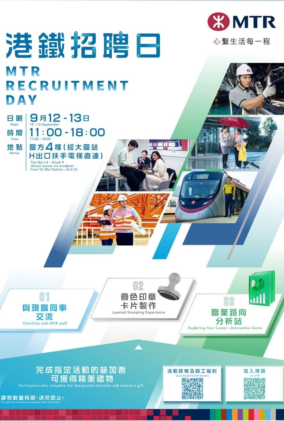 9月12日(1pm-5pm,共4個環節)及13日(1pm-4pm,共3個環節)的招聘日均設有互動時段,由現職員工分享港鐡工作環境及職業生涯發展。