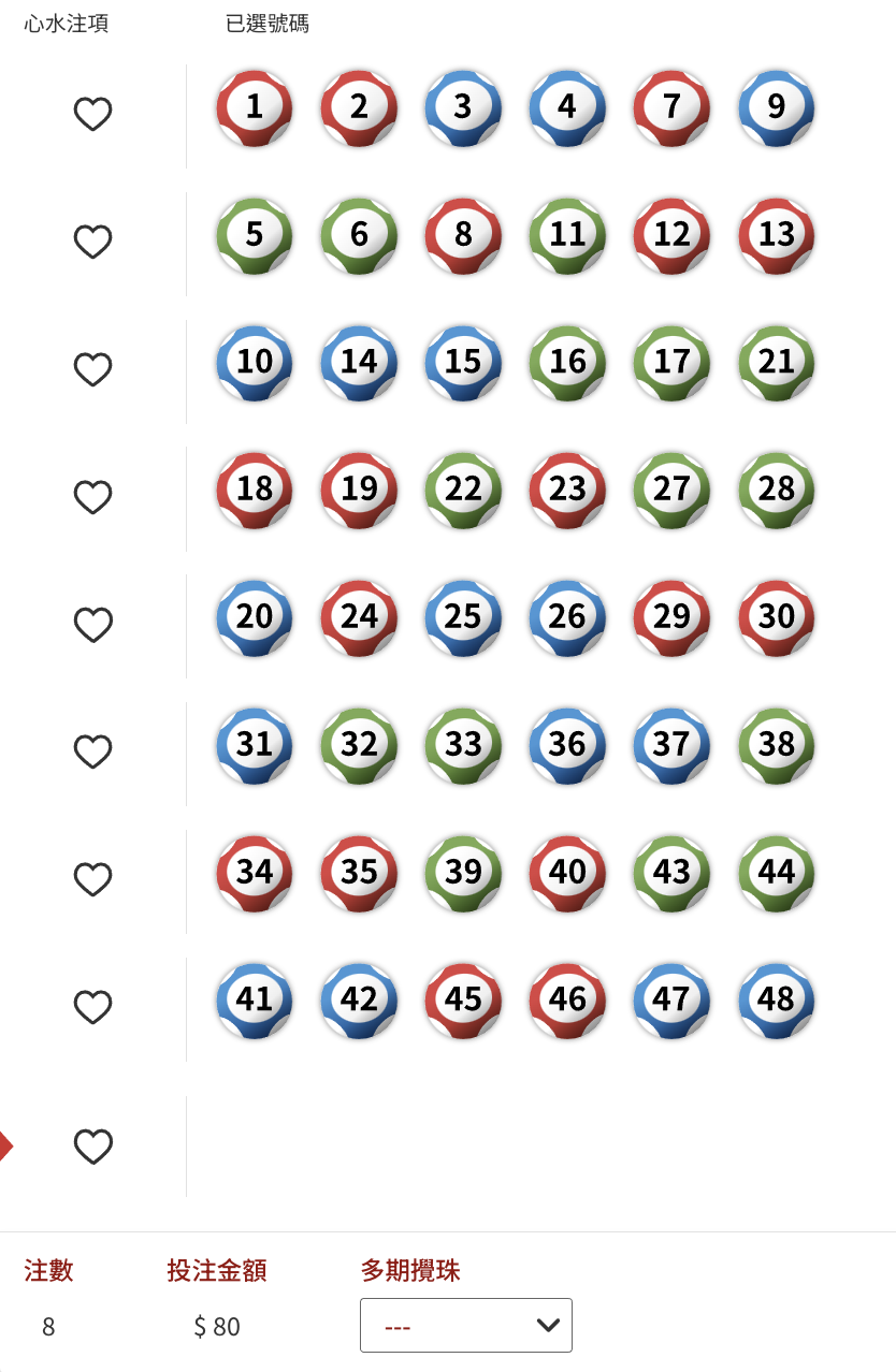 💰用80元買8注,共涵蓋48個號碼,放棄1個中號碼。