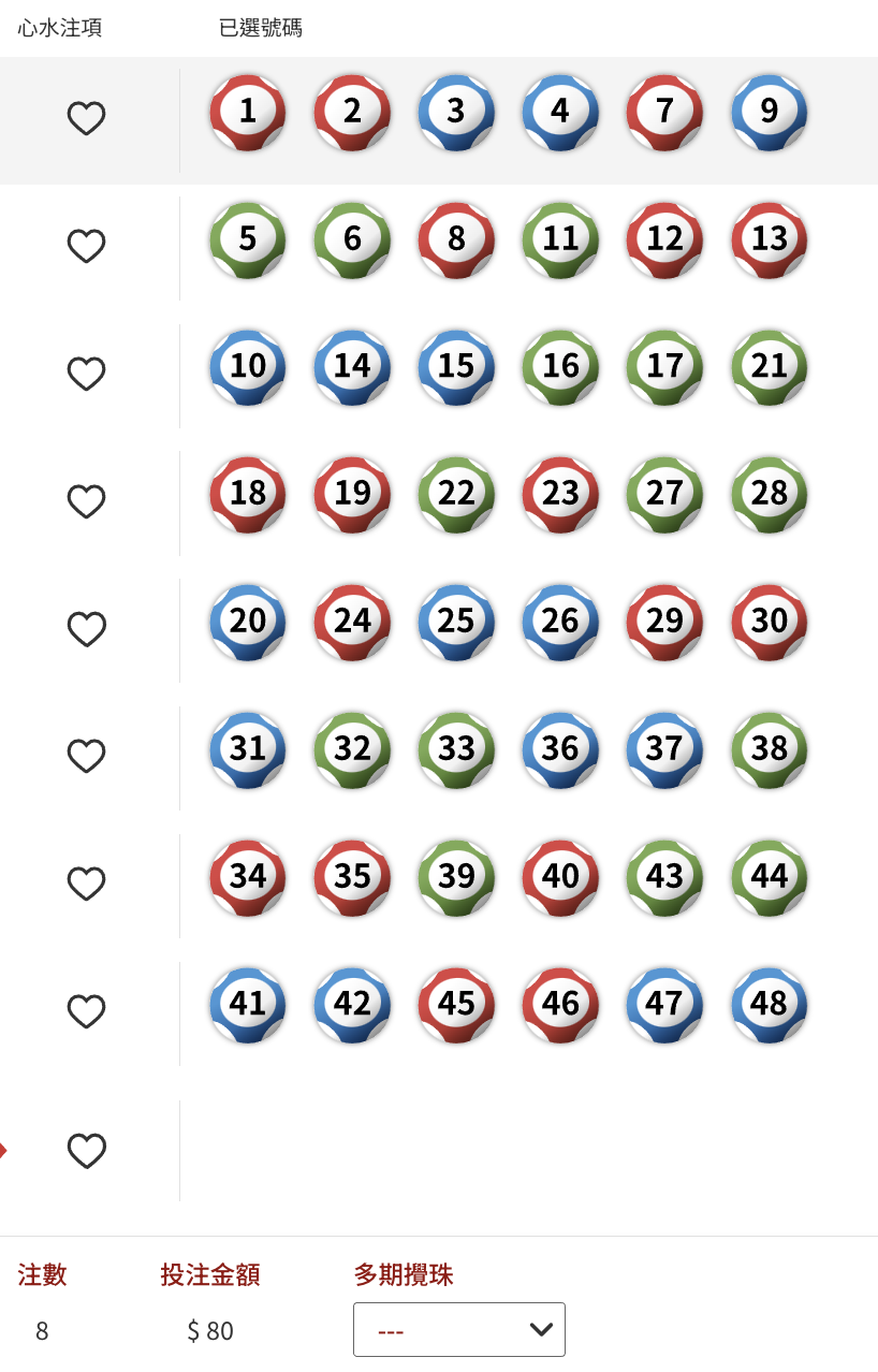 💰用80元買8注,共涵蓋48個號碼,放棄1個紅色號碼。