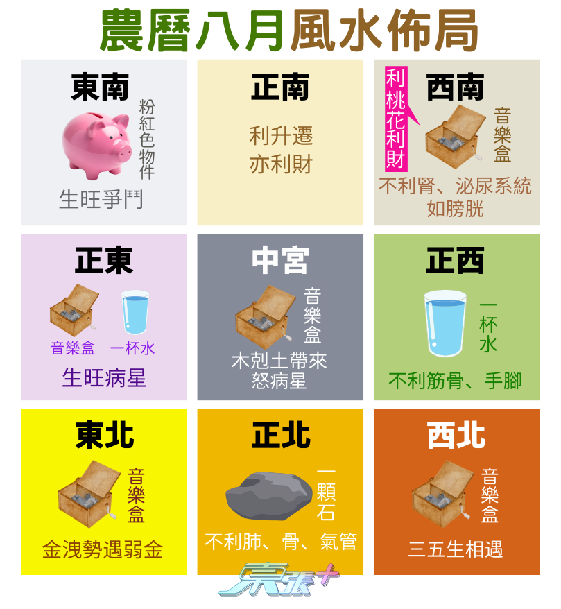西南|本年西南為八白土,本月西南為一白水|土剋水而不利腎、泌尿系統如膀胱,宜放音樂盒連土生水,且有利桃花亦利財。