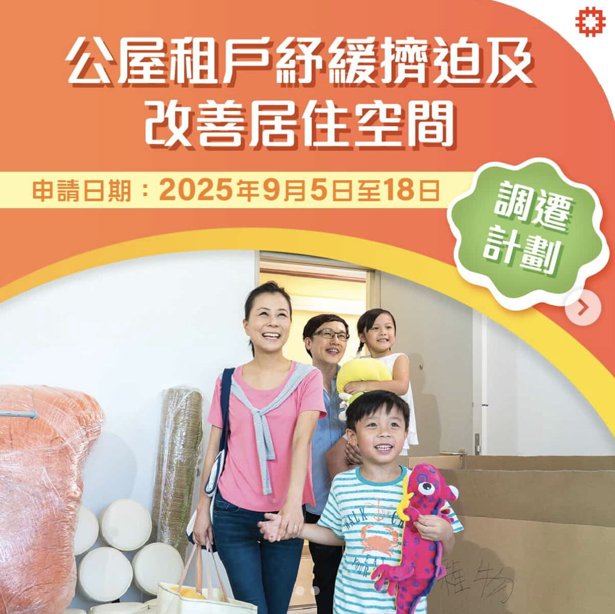 【公屋政策/公屋租戶紓緩擠迫調遷計劃/公屋擠迫戶/香港住屋/公屋租戶/房委會】「公屋租戶紓緩擠迫調遷計劃」及「改善居住空間調遷計劃」(下稱「調遷計劃」)即日起接受合資格嘅公屋租戶申請。合資格公屋租戶可申請調遷至更大單位。以下是該計劃的申請資格、方法、優先原則及獲加分配名額的5大特殊人士類別。