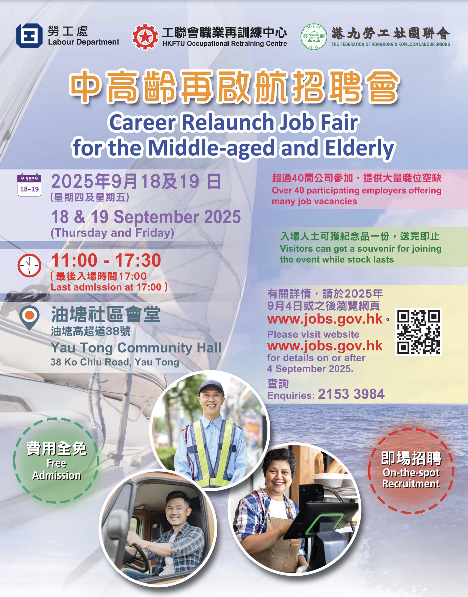 【香港招聘會/中高齡就業機會/中高齡再啟航招聘會2025/勞工處招聘會/免費招聘活動/失業/搵工/裁員/中高齡就業】勞工處將於9月18日至19日於油塘社區會堂舉行「中高齡再啟航招聘會」,為中高齡搵工人士提供2000個職位空缺,涵蓋物業管理、飲食、零售等熱門行業。超過40間機構參與,每日約20間設即場招聘櫃位,招聘工程師、技工、司機、會計、侍應、廚師、店務員及家居照顧員等。約九成職位屬全職,月薪由$11,000至$26,000;九成五職位學歷要求為中六或以下,近半更毋須相關經驗。求職人士可即場遞表及面試。