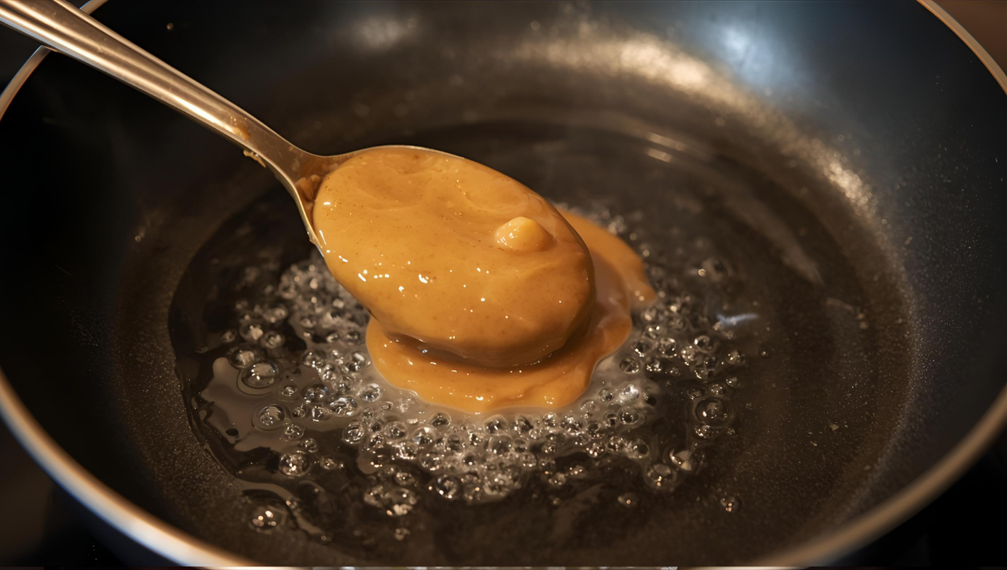 🔴取約一茶匙花生醬入鍋中,輕輕加熱至微微冒煙後熄火。花生醬香氣瞬間取代煮食後殘留油煙味。