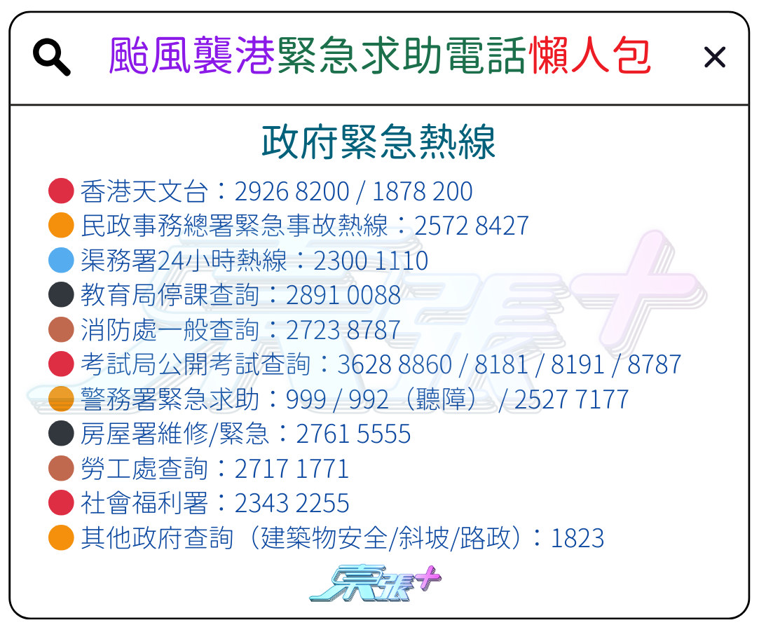 【香港打風|香港天文台|樺加沙|超級颱風|8號風球|10號風球】超級颱風樺加沙(Ragasa)威脅香港,今日(9月23日)下午2時20分,香港天文台將掛出八號烈風或暴風信號。根據美國、加拿大及日本氣象機構預測,樺加沙最高風速可達每小時270公里,被譽為2025年的「風王」,並有機會於9月24日升級至九號或十號風球。颱風期間,如遇到山泥傾瀉、冧樹、水浸、交通停駛、停水停電、甚至被困等緊急狀況,應如何求助?本文整理政府各部門查詢及緊急電話,市民切記及時致電求助。