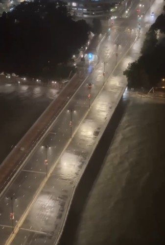 另有居住小西灣的網民在凌晨3時許出門作「風洞測試」,只見對住海面的巴士站範圍風速強勁。至於龍翔道近斧山道位置,更有天橋頂被吹起;城門河則出現倒灌,行人單車徑整個被淹沒。